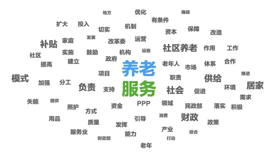 對以上十二項政策文件進行詞云分析,可以發(fā)現(xiàn):近年發(fā)布的老齡產(chǎn)業(yè)相關(guān)政策,涉及土地、融資、醫(yī)療等多個方面,尤其以加強服務(wù)體系建設(shè),增加老齡產(chǎn)品供給為重點。