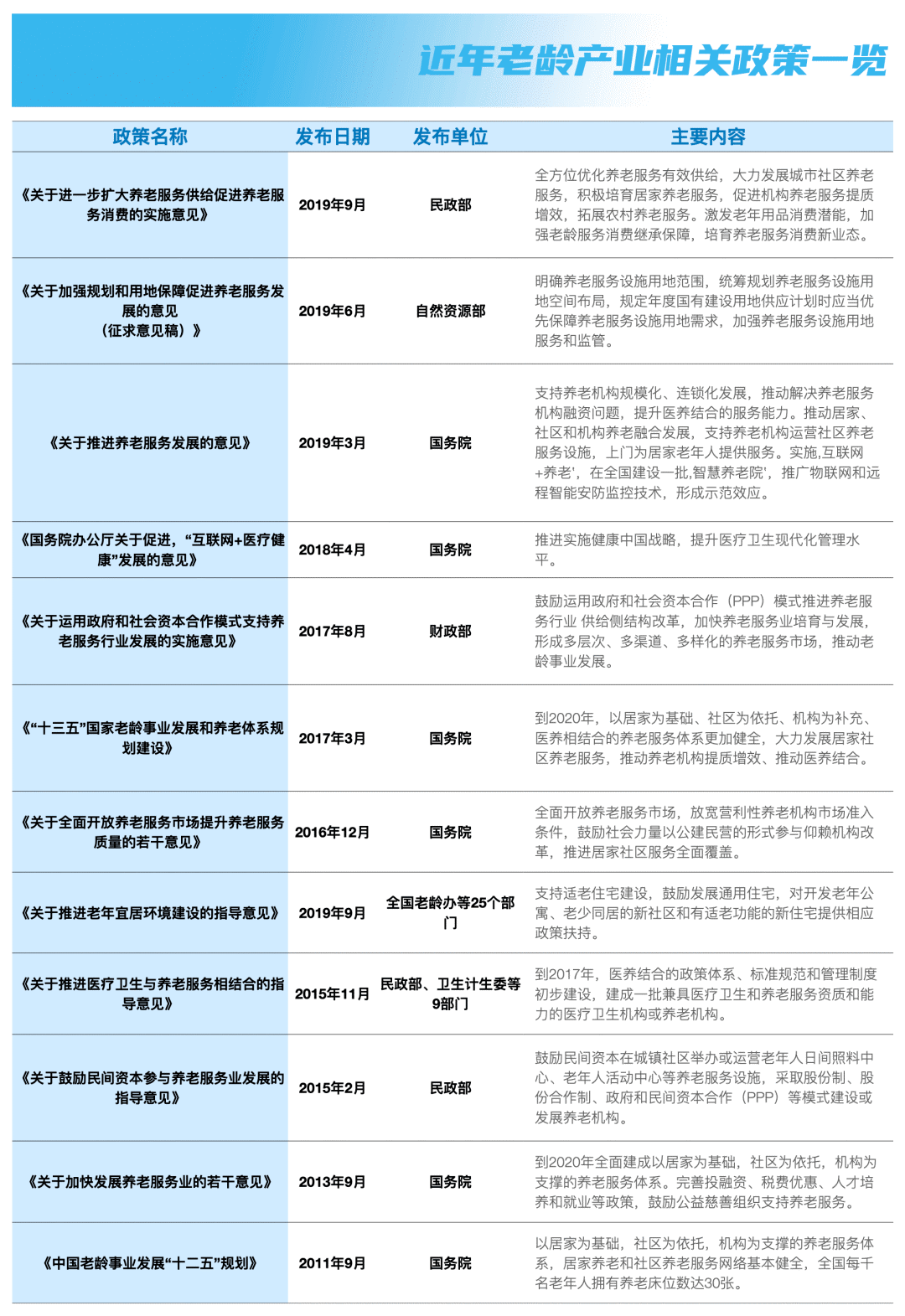 隨著老齡化加速,全國兩會上,來自各個行業(yè)的人大代表、政協(xié)委員提出了多項老齡產(chǎn)業(yè)提案。自“十二五規(guī)劃”開始,政府出臺老齡產(chǎn)業(yè)相關(guān)政策的步伐逐漸加快。僅在2019年,就先后有國務(wù)院、民政部、國土資源部推出相關(guān)政策辦法。