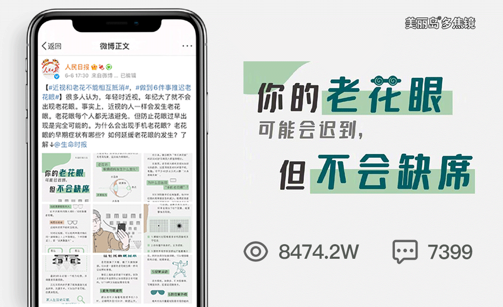 2021年6.6“全國愛眼日”當天,人民日報官方微博發(fā)布話題#近視和老花不能相互抵消#。短短一天內(nèi),該微博閱讀量就達到8474.2萬次,共有7399次討論!